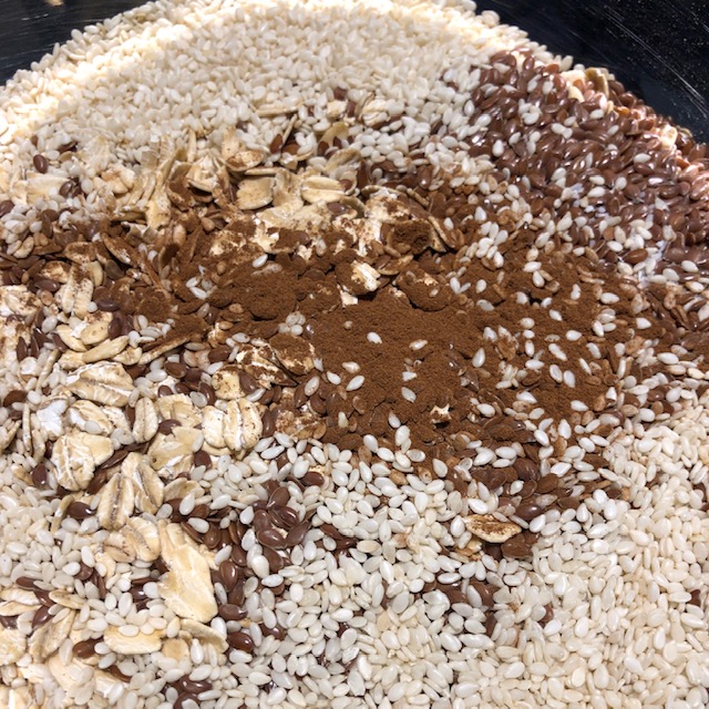 - Combine oats, seeds, salt and cinnamon in a large bowl.