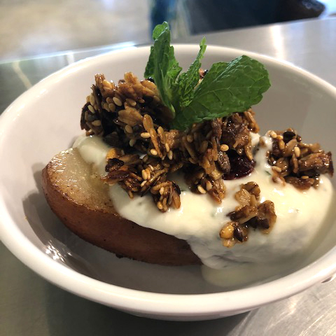 - Turn the pears cut-side up, and let cool. Fill each pear half with yogurt, drizzle with honey, garnish with mint leaves and serve.
