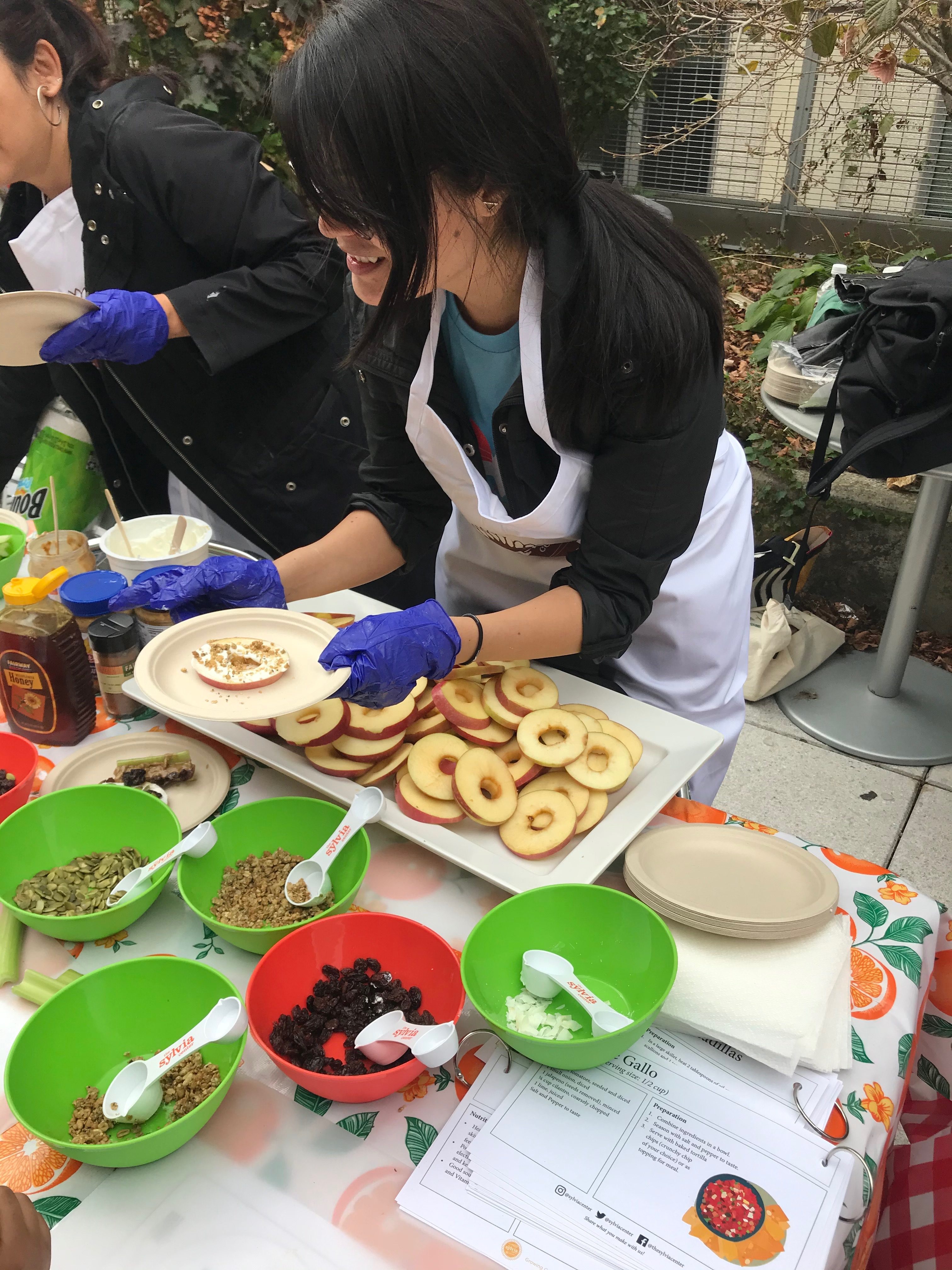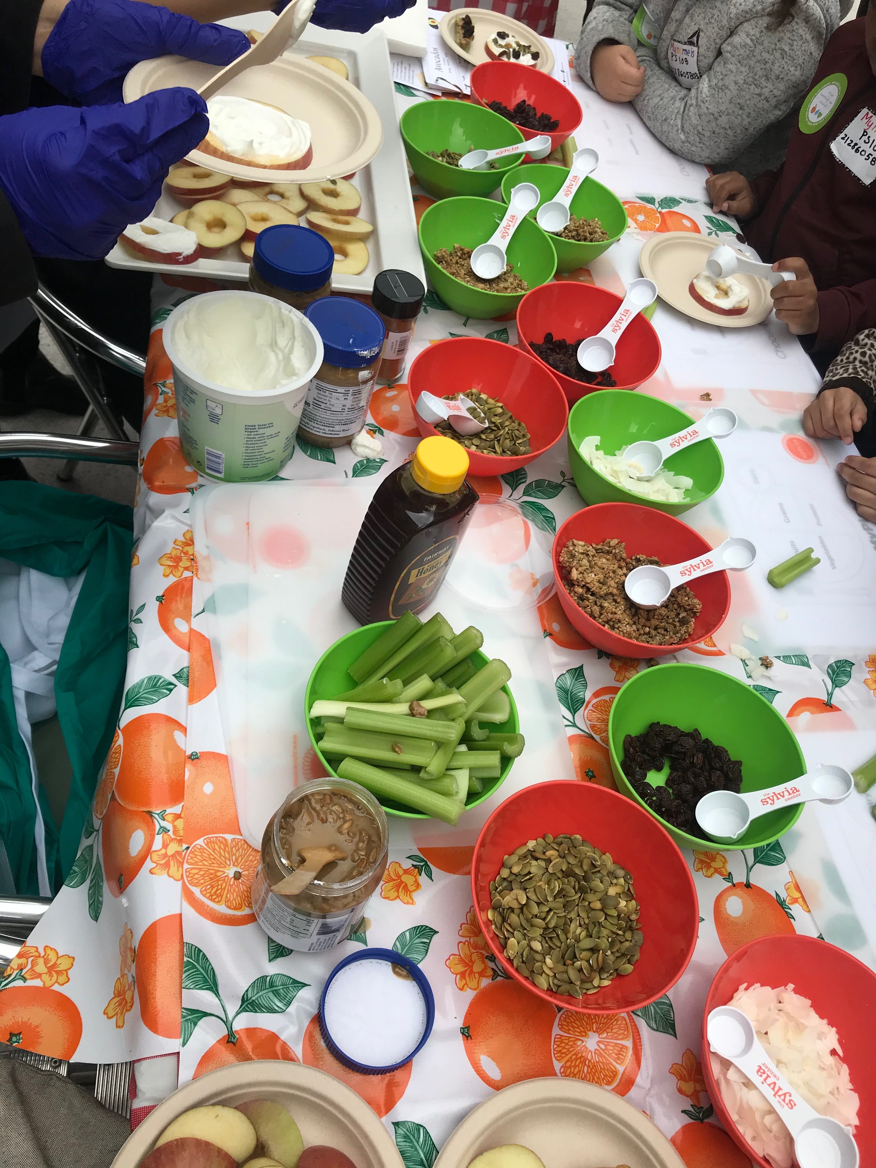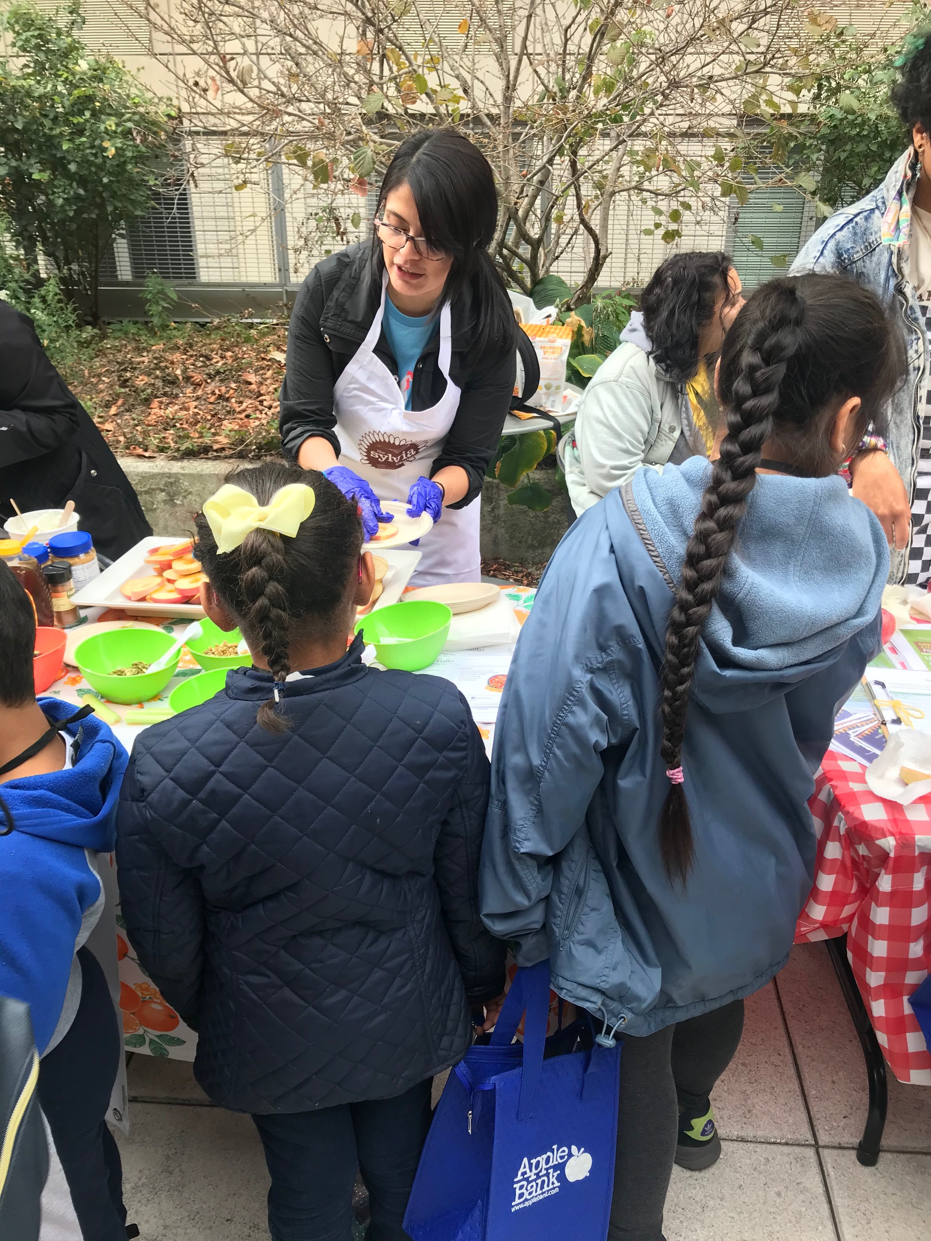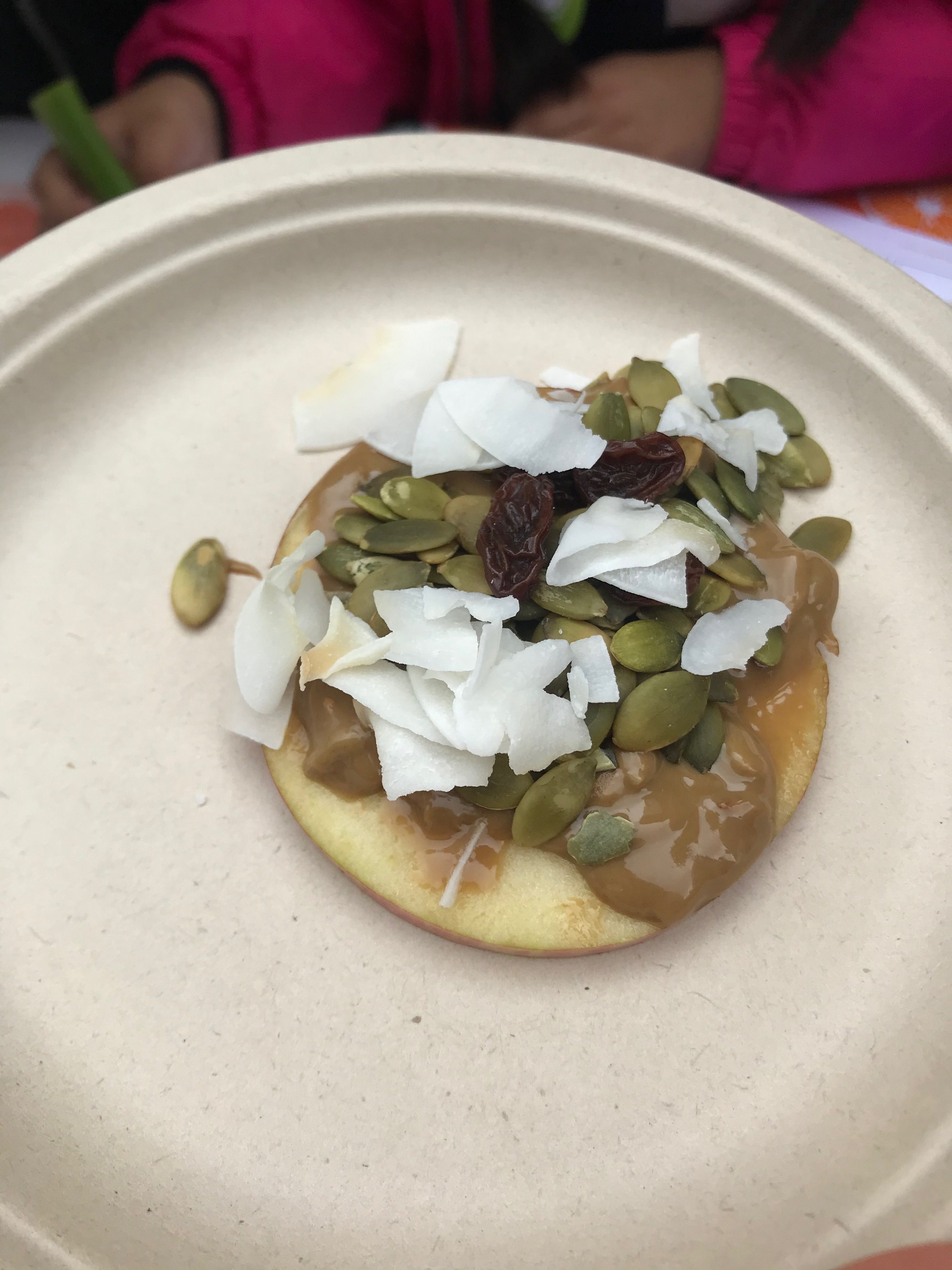 This Wednesday, Hunter College New York City Food Policy Center invited us to celebrate World Food Day by participating in this year’s Big Apple Crunch where children from East Harlem enjoyed healthy eating and fun, nutritionally educational activities. Although we were bracing ourselves for a nor’easter later in the afternoon, the turnout was still a success with hundreds of kids excited to participate in the days events, including making their own apple pizza! Using sliced apple rounds as the “crust” with sunbutter, honey, or yogurt (the most popular) as the “sauce”, the children topped their own apple pizzas with granola, coconut, raisins, dried cranberries, and pepitas. Many children were curious to try the toppings which they had never eaten before. Some even said they would like to eat apple pizzas at home, and a few even braved a taste of an “ants on a log”, made of celery stuffed with sunbutter and topped with raisins, which we offered to make this a nutritionally complete snack that hit all the food groups: fruits, vegetables, whole grains, protein, and dairy. The adults loved it too, and many were excited to try an alternative to nut-butter, a great option for those with nut allergies and sensitivities. We were so happy to be invited to the event and look forward to doing it again next year!
