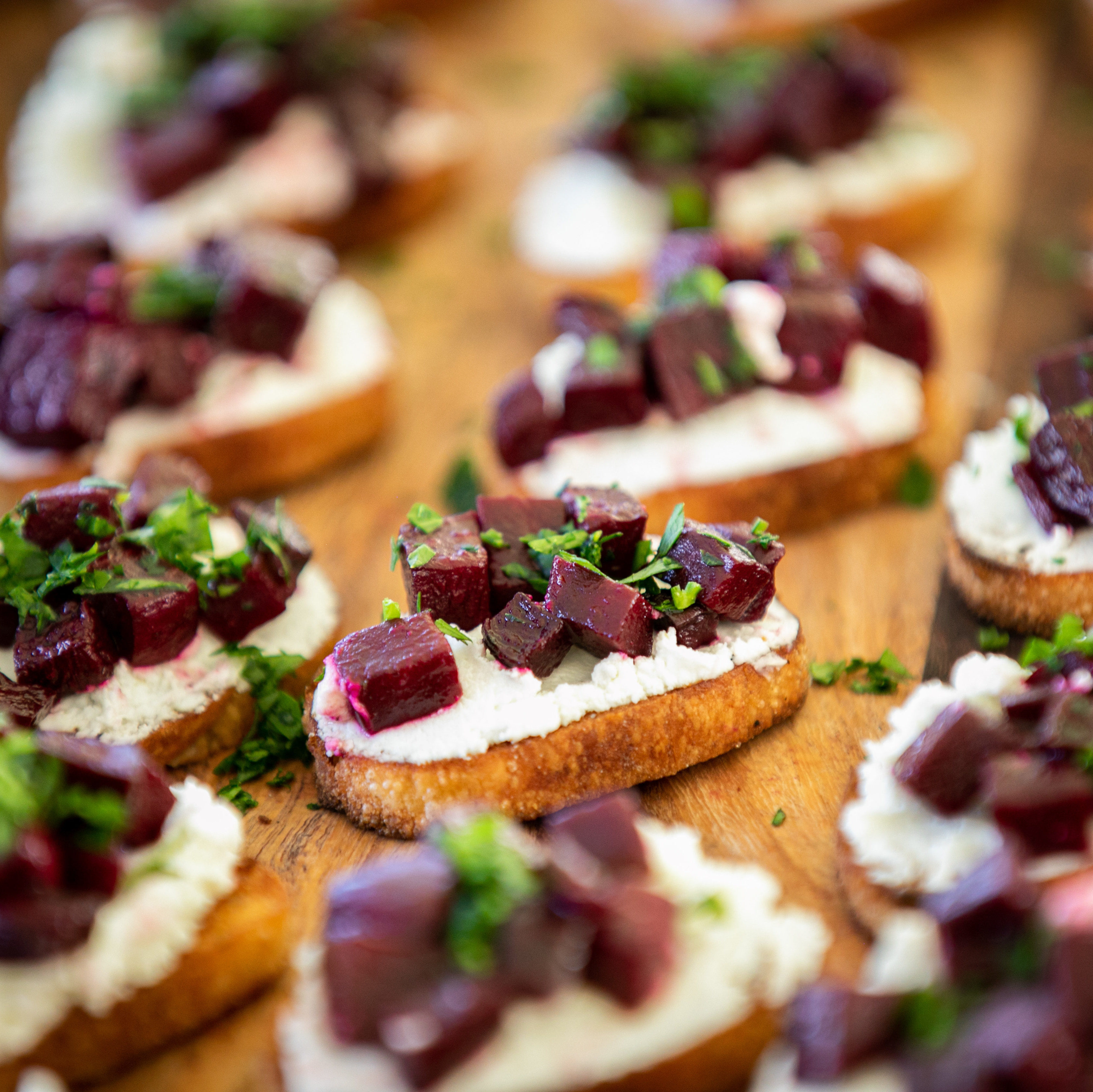 - After beets are cooled, top each goat cheese toast with a generous spoonful of beets. Garnish with parsley.