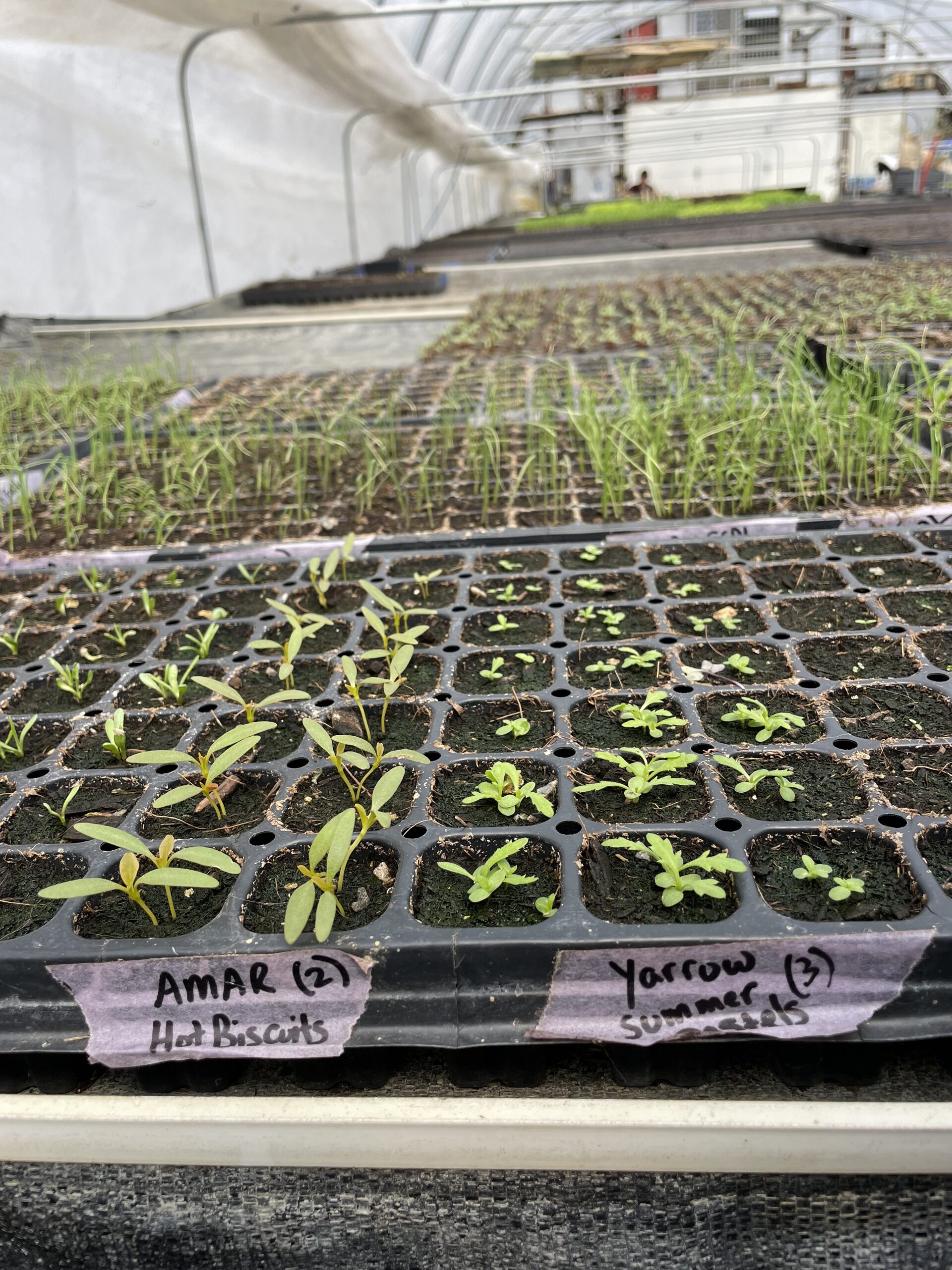 Each year, we begin seeding plants for The Learning Garden around the first week of March. Now, in our third week of April, the Katchkie Farm nursery greenhouse is filling up quickly with trays of new seedlings. Our onion seedlings–generally the earliest veggies to be seeded each year–are now over three inches tall.
