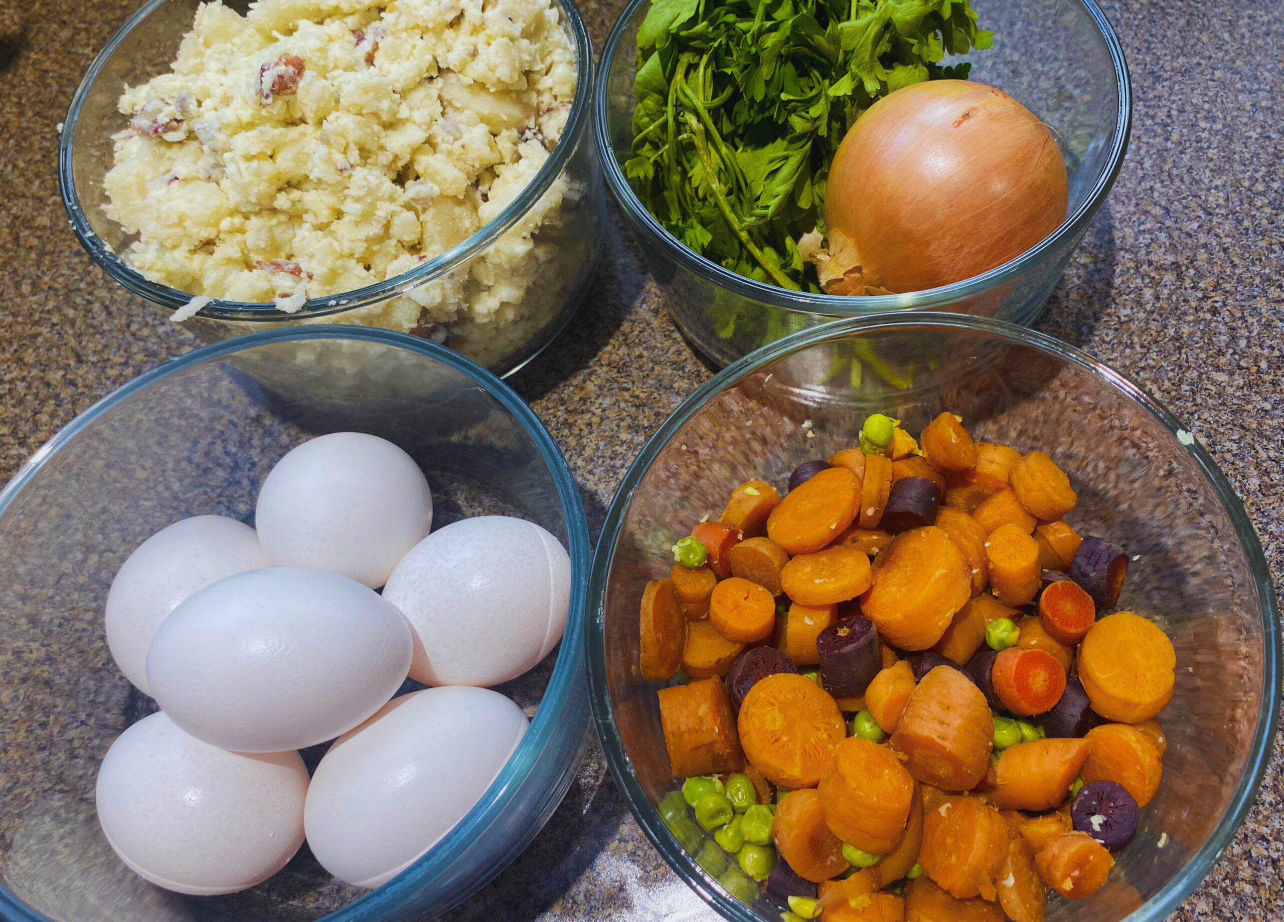 3 C leftover cooked vegetables (cabbage, kale, peas, rutabaga, carrots, Brussels sprouts), chopped