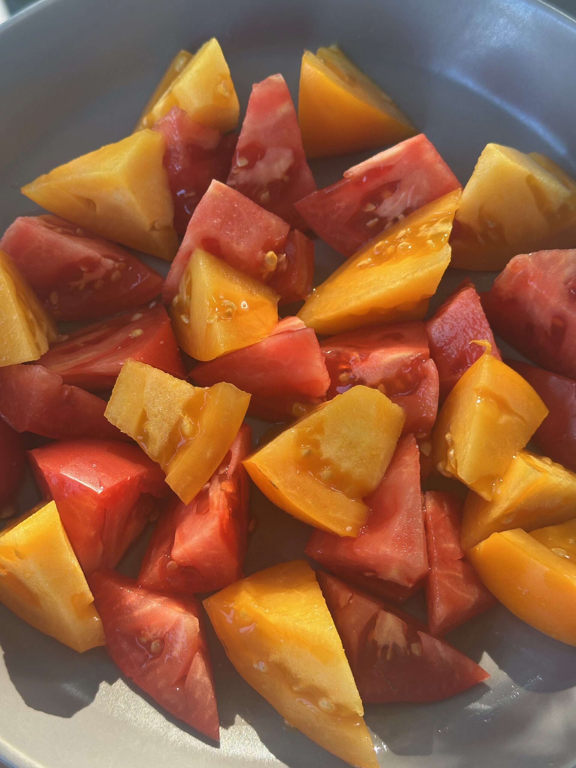 - Prepare the tomatoes. Using a very sharp knife, carefully slice large tomatoes into ¼-inch slices. Cut small tomatoes in half, and medium tomatoes into quarter- or eighth-wedges. Salt and drizzle with oil, set aside.