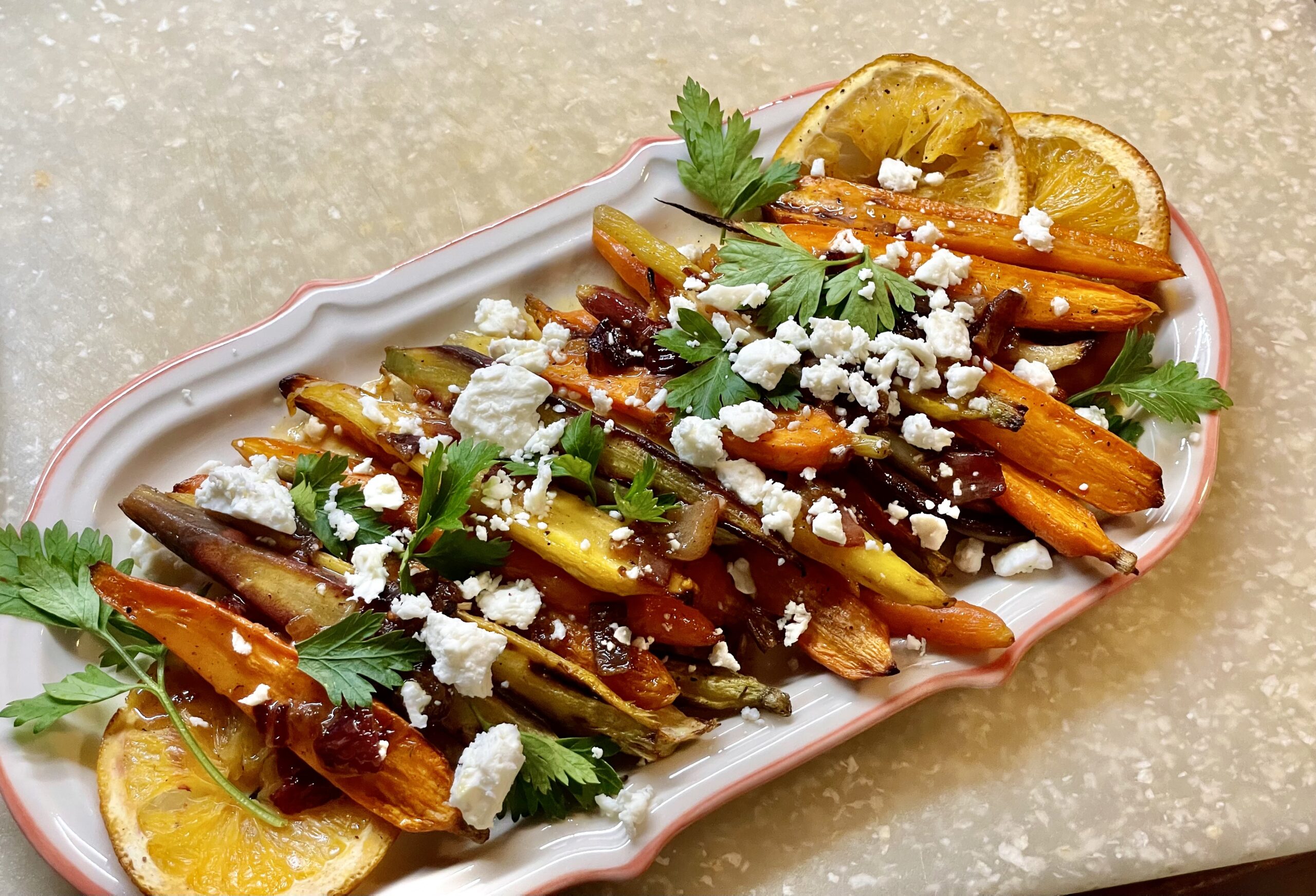 1. Start by making the carrots. Preheat oven to 400°. Place the carrots on a large rimmed baking sheet. Drizzle with oil and season with salt and pepper, and toss to coat. Add the orange slices and gently toss to combine. Roast in oven, stirring halfway through, until the carrots are browned in spots and fork-tender (around 30–40 mins). Allow to cool slightly.