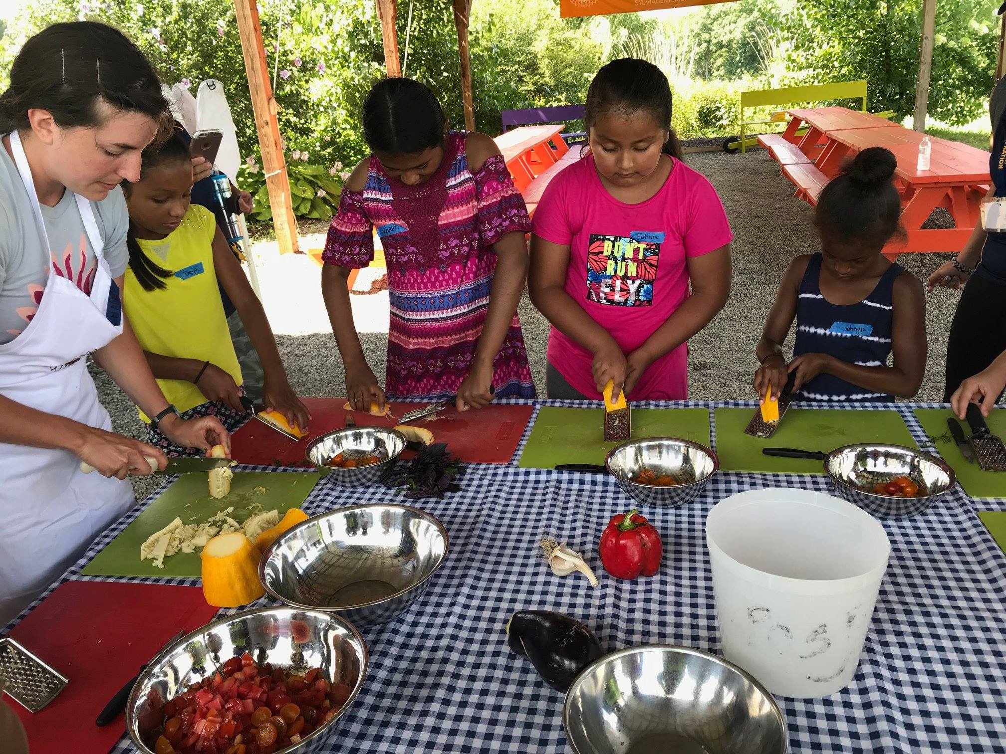 Through our Fresh Food Programs, local summer recreation program – Hudson Bluehawk Nation summer camp students made a visit to Katchkie Farm and the learning garden. Young people explored different crops like beans and lettuces and picked their own vegetables. For the hot summer day, they made rustic summer ratatouille and herb cucumber salad.
