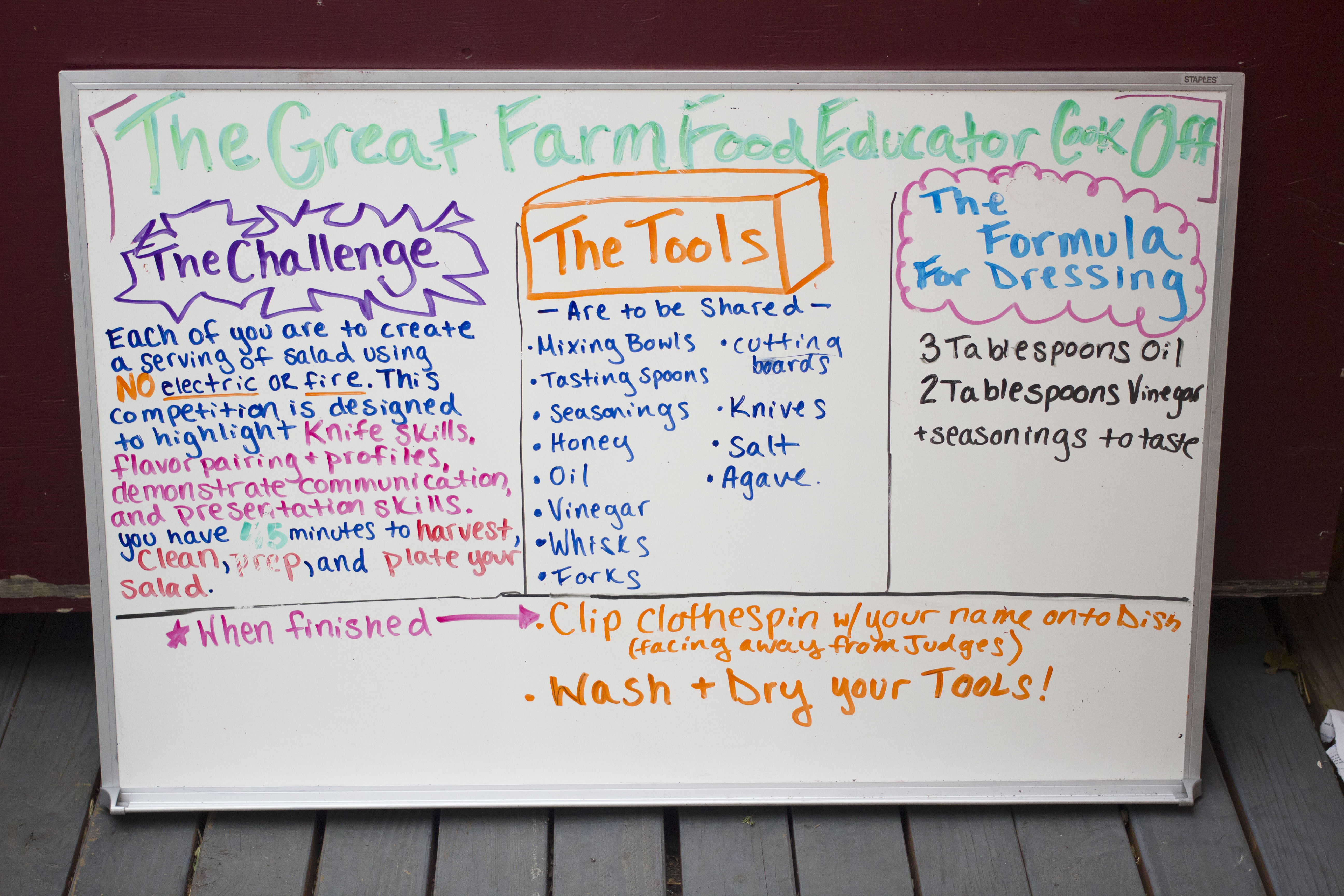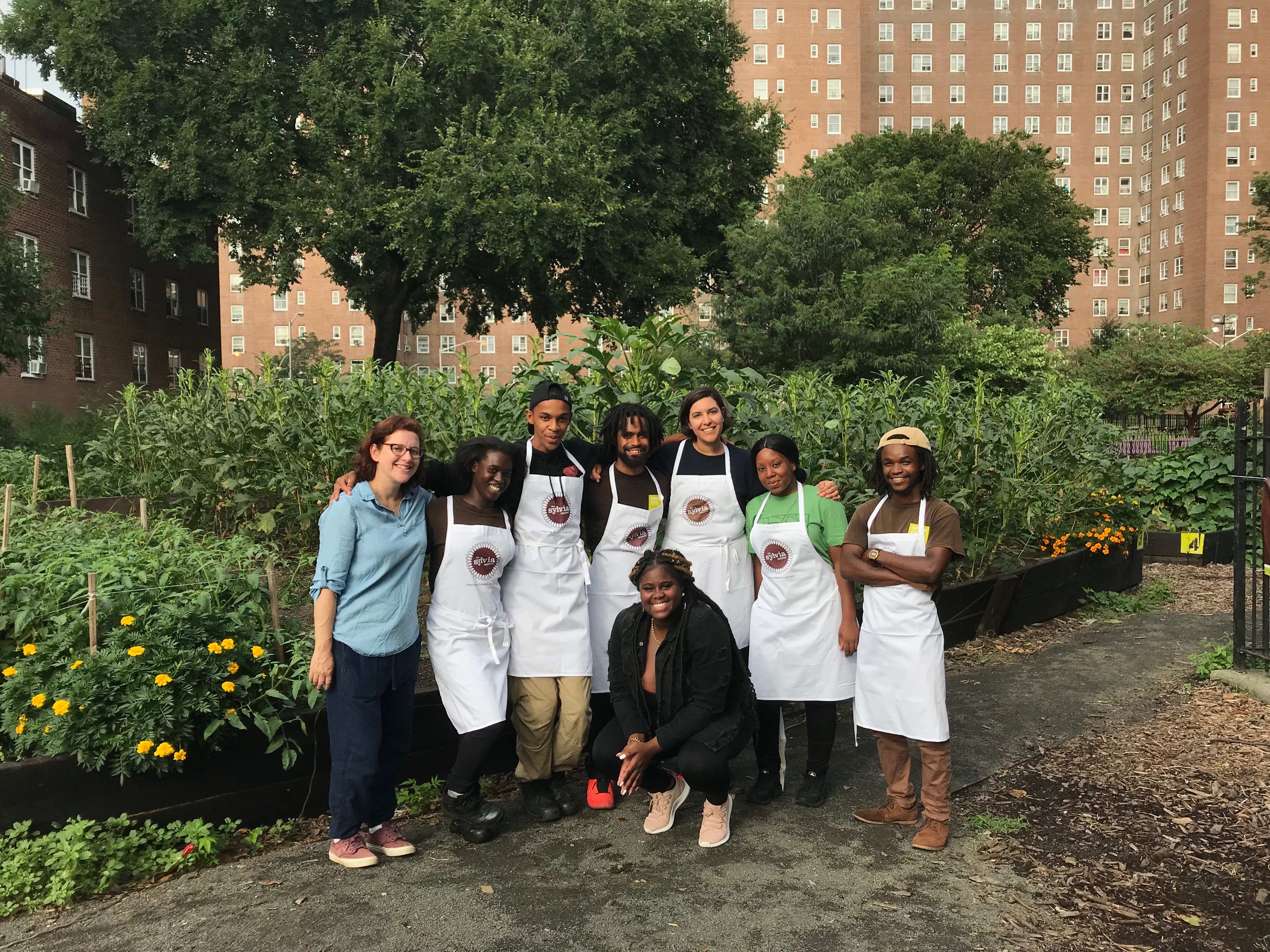In the final week of the Farm Food Educators training series, Green City Force (GCF) AmeriCorps members came together for a competitive cook off. The challenge required GCF students to harvest produce from the Red Hook Houses Farm, clean, prep, and plate an individual salad in only 45 minutes. In addition, they were judged on their newly-acquired knife skills and culinary technique by creating an emulsified, well-blended salad dressing.