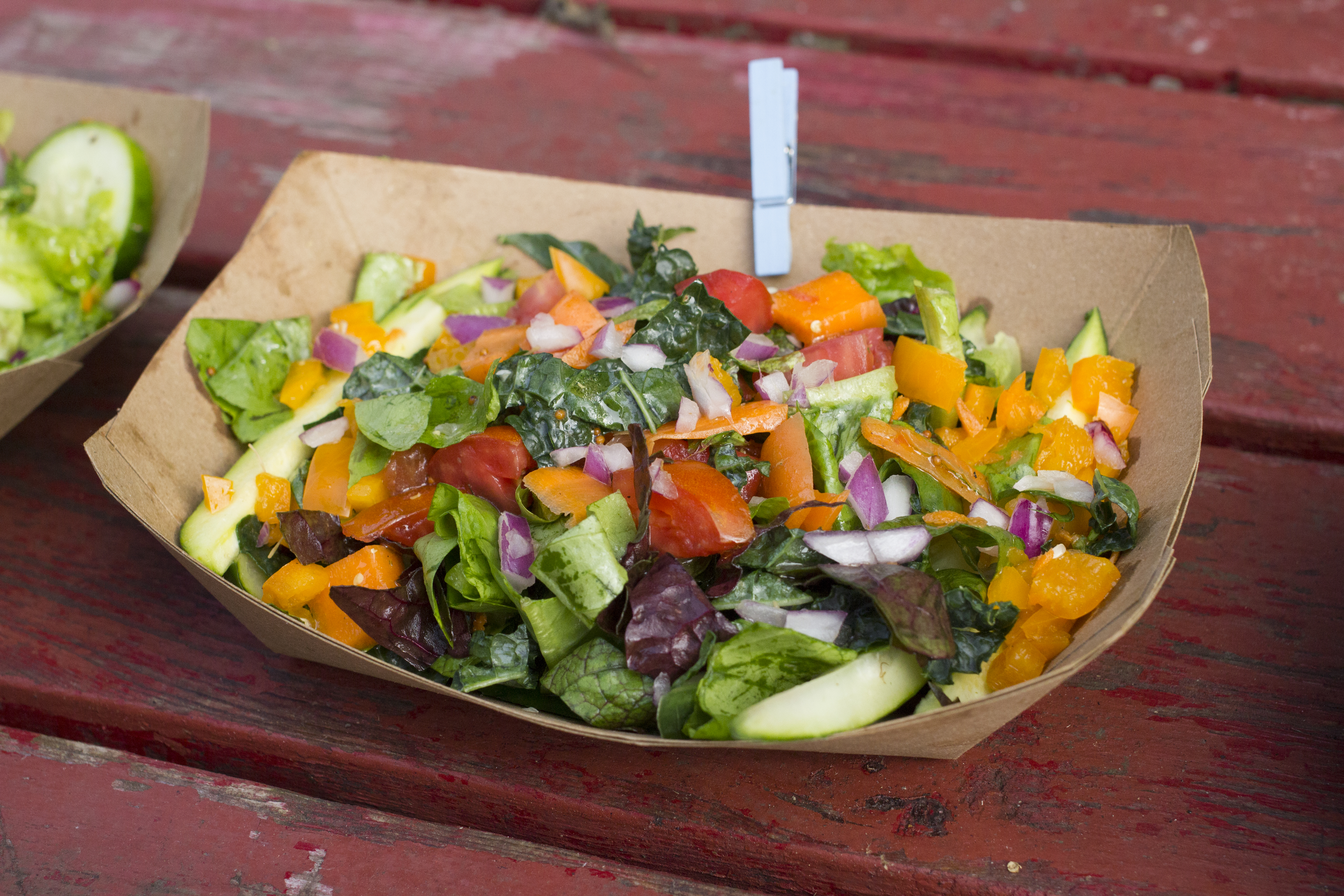 Community Chef Instructor Sam strongly suggested utilizing mise en place to organize their ingredients under the tent at the farm, and to think about which flavors to highlight in their dressings. At the very start of the competition, Justin, Lisa, and Steve ran to harvest a bounty of greens — including lettuce, mustard greens, and swiss chard. Britney and Thomas were late to the competition but quickly caught up. After washing their greens, the challengers returned to their stations to set up and chop their selected bounty of vegetables.