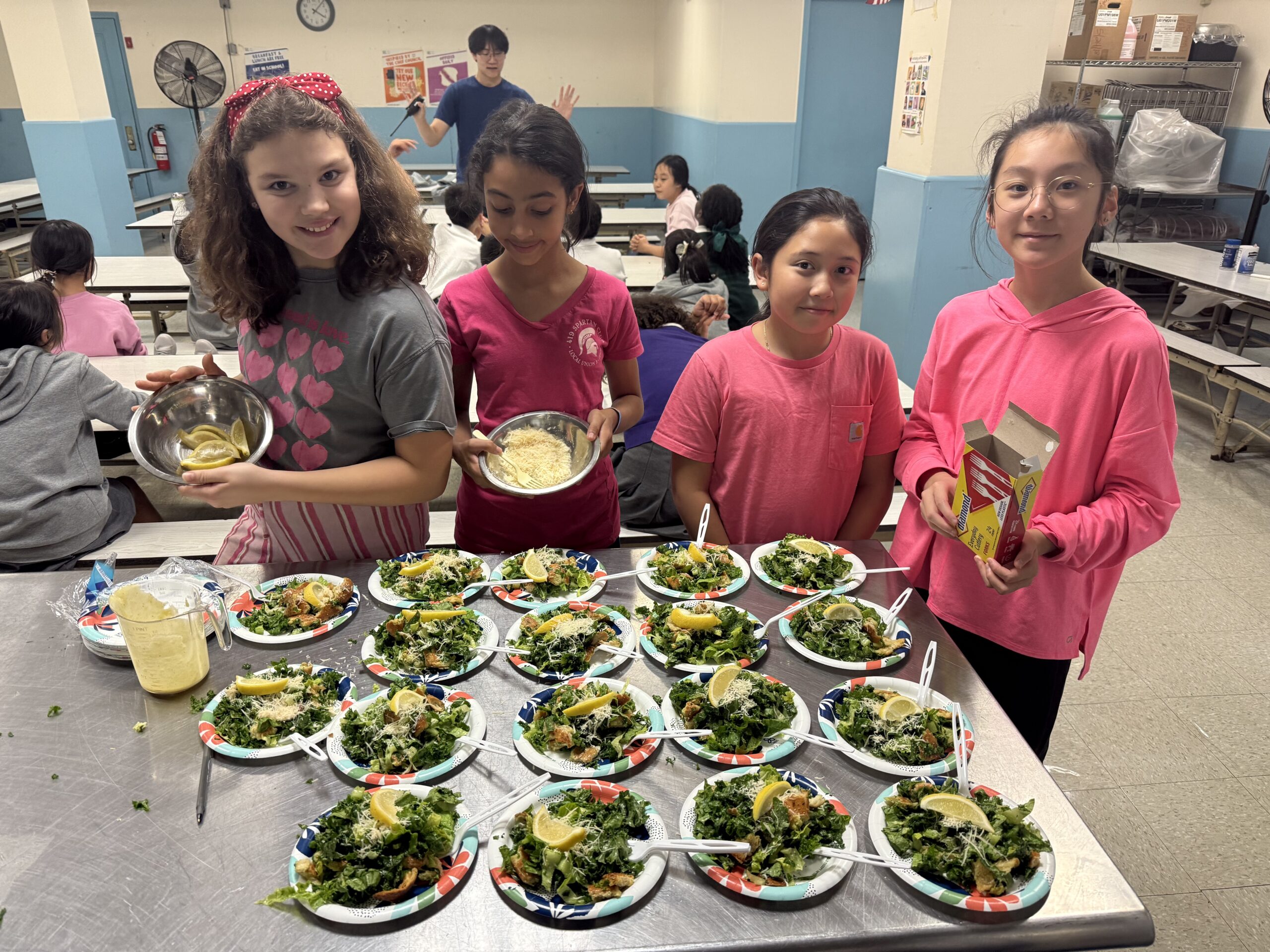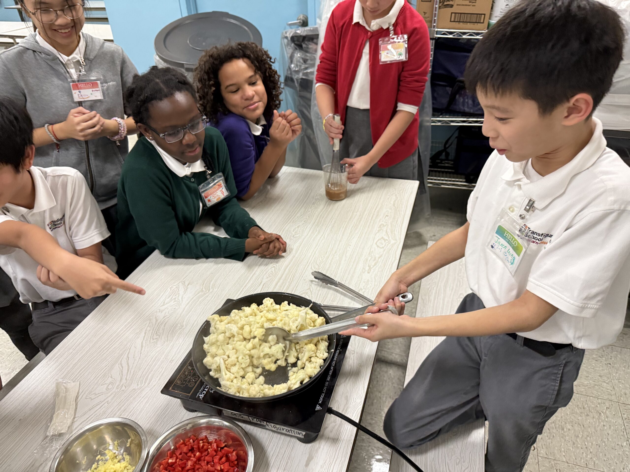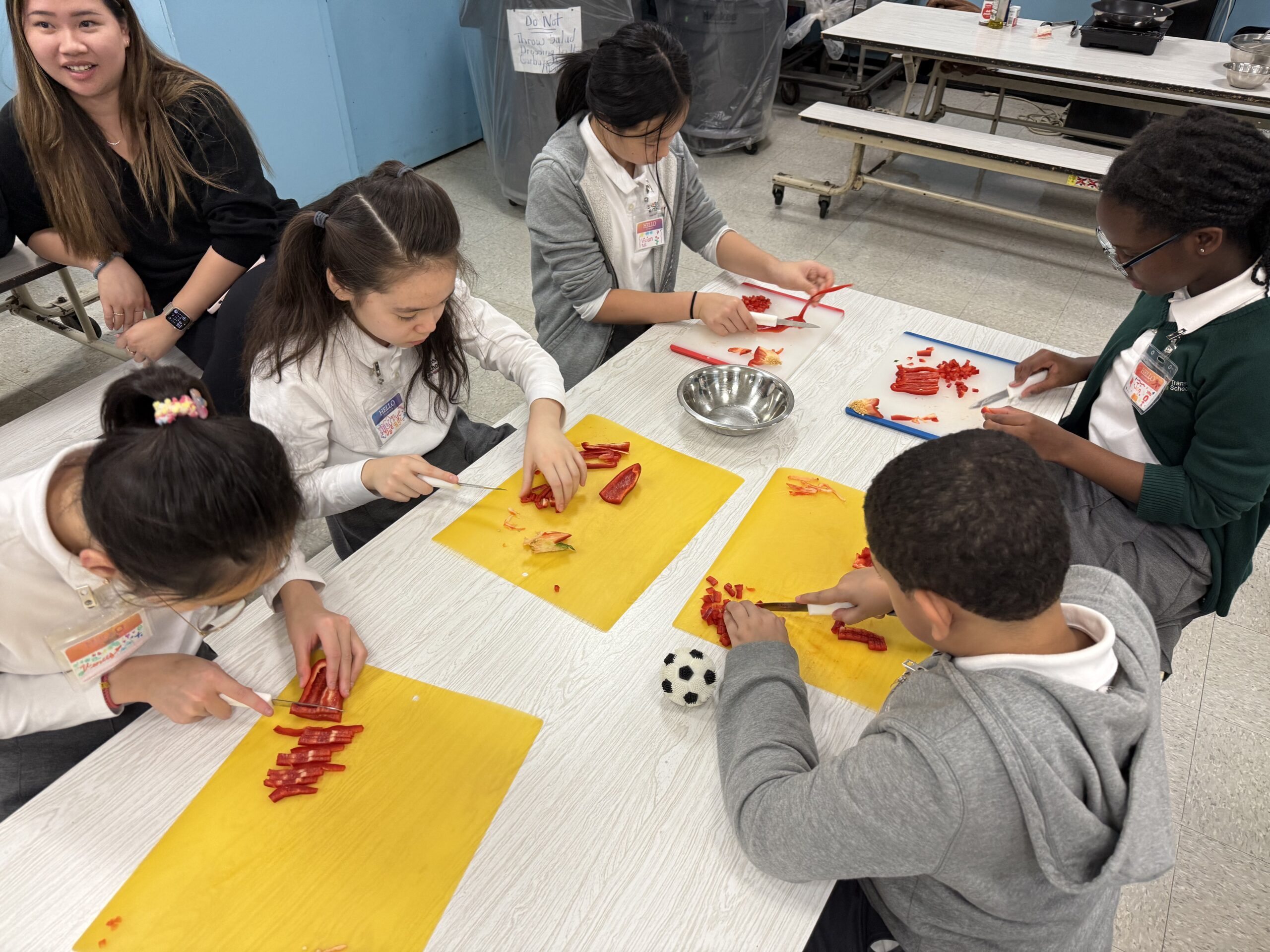 This fall, our Cooks for Health middle school program at Transfiguration School in Manhattan with Chef Educator Georgia and Assistant Janeil has been buzzing with energy. With nearly 20 students each week, this group is one of our largest—and definitely one of our most enthusiastic. From the very first session, students created an “all-hands-in agreement,” setting shared commitments around respect, teamwork, and trying new things. That spirit shows up in every class: every single student wants a turn whisking, chopping, sautéing, or plating. No observers—just full-on participants.